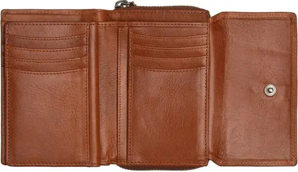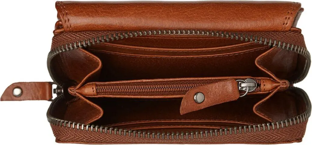 Salviano er með tvö aðalhólf, sem gerir þér kleift að skipuleggja hlutina þína á skilvirkan hátt. Eitt aðalhólf opnast með loki og tveimur smelluhnöppum, sem gerir það auðvelt að festa það jafnvel þegar það er fullt. Þetta hólf gefur pláss fyrir allt að sextán kort og inniheldur ýmsar raufar fyrir seðla, kvittanir og nafnspjöld. Hitt aðalhólfið lokast með rennilás og er deilt með auka rennilásvasa. Á hvorri hlið þessa vasa finnurðu raufar fyrir fjögur kort í viðbót. Þetta hólf hefur líka nóg pláss fyrir mynt.
