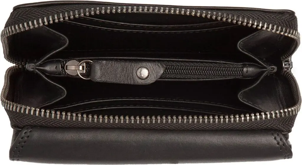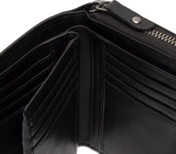 Salviano leðurveskið frá The Chesterfield Brand er tilvalið veski fyrir alla sem bera mikið á sér en vilja samt netta lausn. Þetta stílhreina leðurveski passar auðveldlega í litla töskur og býður upp á ótrúlega mikið geymslupláss. Salviano er með tvö aðalhólf, sem gerir þér kleift að skipuleggja hlutina þína á skilvirkan hátt. Eitt aðalhólf opnast með loki og tveimur smelluhnöppum, sem gerir það auðvelt að festa það jafnvel þegar það er fullt. Þetta hólf gefur pláss fyrir allt að sextán kort og inniheldur ýmsar raufar fyrir seðla, kvittanir og nafnspjöld. Hitt aðalhólfið lokast með rennilás og er deilt með auka rennilásvasa. Á hvorri hlið þessa vasa finnurðu raufar fyrir fjögur kort í viðbót. Þetta hólf hefur líka nóg pláss fyrir mynt. Salviano er búinn nýjustu RFID tækni , sem verndar gegn þjófnaði með snertilausri greiðslu. Leðurfóðrið inniheldur sérstakt lag sem heldur gögnunum þínum öruggum án þess að þörf sé á hörðu málmhylki.