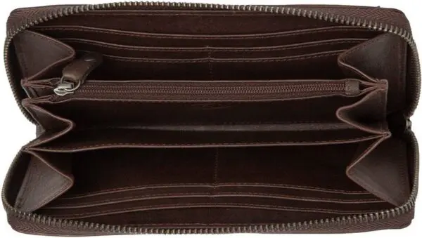 Þetta Livorno leðurveski frá The Chesterfield Brand er hið fullkomna veski fyrir alla sem vilja hafa mikið með sér. Veskið hefur pláss fyrir allt, allt frá kortum og kvittunum upp í mynt og seðla. Þökk sé grannri hönnuninni passar veskið auðveldlega í hvaða tösku sem er eða er hægt að bera það á stílhreinan hátt í höndunum.Livorno samanstendur af aðalhólfi sem lokast með rennilás. Aðalhólfið skiptist í fjóra hluta. Í fyrsta hlutanum finnurðu ýmsa vasa, þar á meðal fjóra sérstaklega fyrir kort. Hér getur þú einnig geymt kvittanir og reikninga. Annar hlutinn inniheldur auka vasa og þriðji hlutinn er geymsluhólf með rennilás, tilvalið til að bera mikið af myntum. Síðasti hlutinn hefur aftur nóg af vasa, þar á meðal fjórum fyrir kort. Á bakinu er þetta leðurveski með auka geymsluvasa með rennilás.
