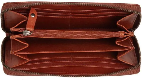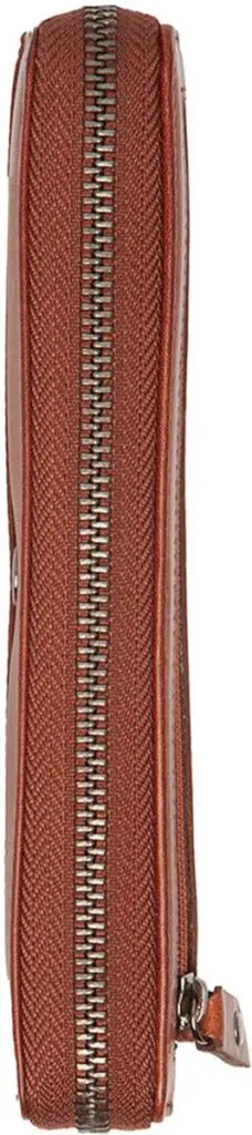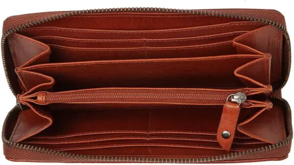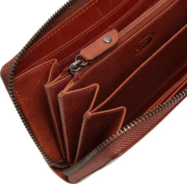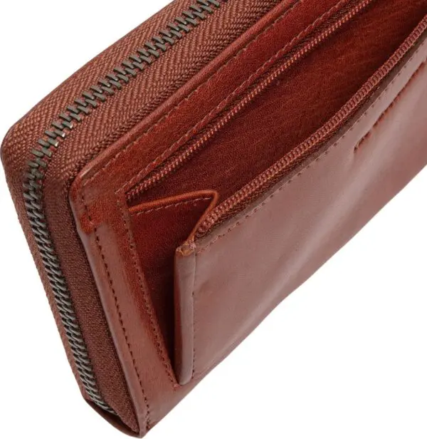 Þetta Livorno leðurveski frá The Chesterfield Brand er hið fullkomna veski fyrir alla sem vilja hafa mikið með sér. Veskið hefur pláss fyrir allt, allt frá kortum og kvittunum upp í mynt og seðla. Þökk sé grannri hönnuninni passar veskið auðveldlega í hvaða tösku sem er eða er hægt að bera það á stílhreinan hátt í höndunum.Livorno samanstendur af aðalhólfi sem lokast með rennilás. Aðalhólfið skiptist í fjóra hluta. Í fyrsta hlutanum finnurðu ýmsa vasa, þar á meðal fjóra sérstaklega fyrir kort. Hér getur þú einnig geymt kvittanir og reikninga. Annar hlutinn inniheldur auka vasa og þriðji hlutinn er geymsluhólf með rennilás, tilvalið til að bera mikið af myntum. Síðasti hlutinn hefur aftur nóg af vasa, þar á meðal fjórum fyrir kort. Á bakinu er þetta leðurveski með auka geymsluvasa með rennilás.