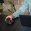 Veskið opnast í þrjá hluta. Í fyrsta hlutanum eru raufar fyrir sex spil. Þegar þú snýrð þessum hluta yfir, finnurðu fleiri raufar fyrir þrjú spil í viðbót og smelluvasa fyrir mynt. Efst eru tvö hólf fyrir seðla eða kvittanir.