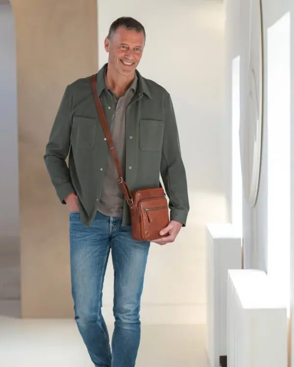 Leðuraxlartaskan Bremen er með aðalhólf með rennilás. Í aðalhólfinu er geymsluhólf með rennilás að innan. Tvö auka geymsluhólf eru að framan. Til að nota fyrir veski, kort eða gleraugu. Þessi axlartaska er einnig með rennilás hólf aftan á.