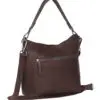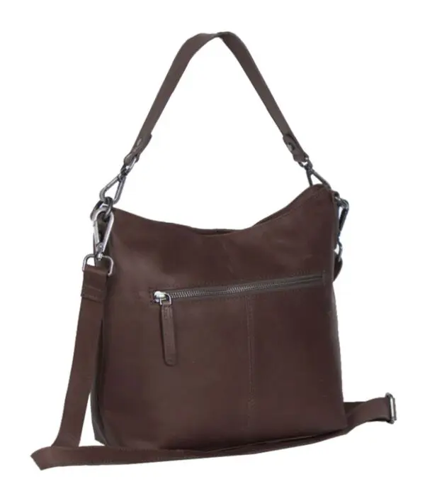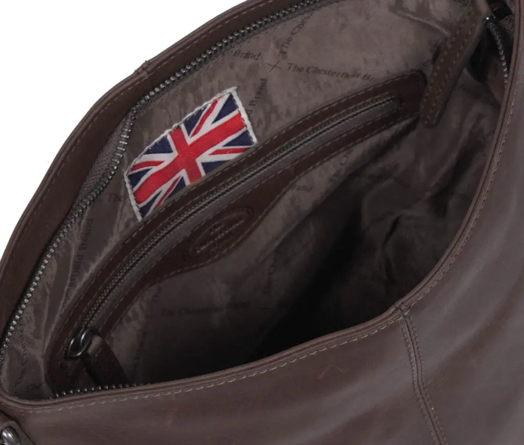 Þessi hágæða brúna leðurtaska er með fallegum rennilás að ofan. Innan í henni eru tvö renniláshólf og tvö önnur hólf til að geyma skjöl og persónulega muni. Þar að auki er handhægur vasi fyrir snjallsímann þinn.