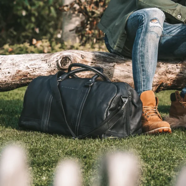 Þessi helgartaska úr leðri er með stórt aðalhólf (40 lítrar) og að innan er aukahólf með rennilás. Aðalhólfið lokast með mjúkri rennilás. Helgartaskan er með aftakanlegri og stillanlegri axlaról. Handföngin eru sérstaklega breið og því þægileg í hendinni.
