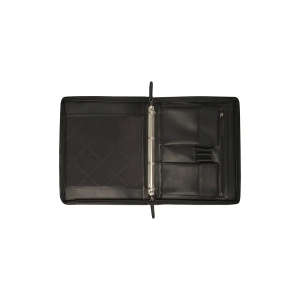 Þú getur lokað Moreton alveg með rennilás. Þegar mappan er opnuð eru ýmsir geymslumöguleikar. Í fyrsta lagi er fjögurra hringa mappa sem heldur öllum skjölunum þínum á sínum stað án þess að þau losni í möppunni. Öðru megin eru fjögur geymsluhólf: tvö eru fyrir snjallsíma, eitt er með rennilás og að lokum er opinn geymsluvasi. Að auki er pláss fyrir þrjá penna. Hinu megin er rauf sem er opin bæði að ofan og neðan, sem gerir þér kleift að geyma skjöl eða jafnvel spjaldtölvu. Að lokum er aftan á möppunni annað geymsluhólf með rennilás.