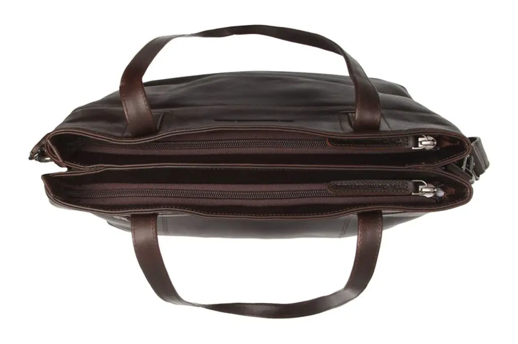 Þessi leðurverslunartaska frá Nola er með þægilegu skipulagi með tveimur rúmgóðum aðalhólfum, hvort með renniláslokun. Hólfin eru nógu stór til að geyma allar mikilvægar nauðsynjar: hugsaðu um símann þinn, veskið þitt, lykla, sólgleraugu eða bók. Í fyrsta aðalhólfinu er styrktur spjaldtölvuvasi, fullkominn ef þú vinnur með spjaldtölvu eða iPad. Að auki innihalda hólfin ýmsa handhæga geymsluvasa til að halda skipulagi. Þar geturðu geymt penna, kort eða símann þinn. Taskan er með aftakanlegri og stillanlegri axlaról, svo þú getur valið hvernig þú vilt bera hana. Þar að auki hefur Nola taskan tvö sterk handföng fyrir fleiri burðarmöguleika.