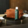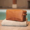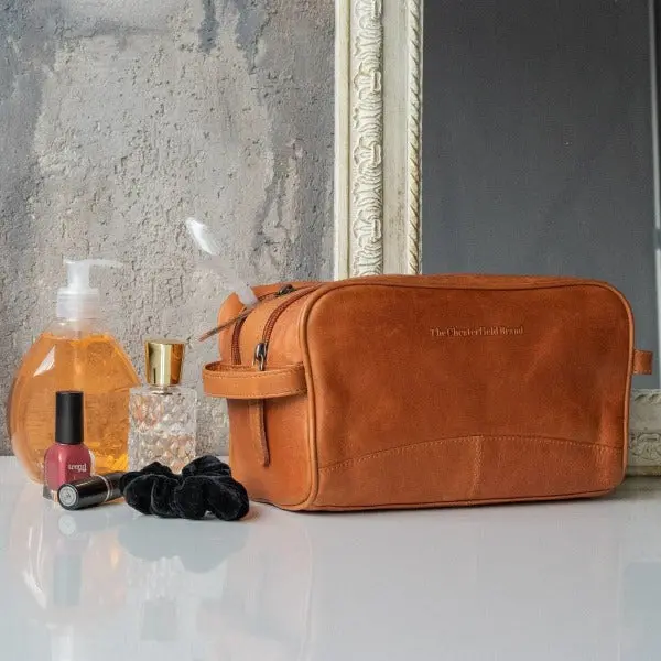 Geymdu allar snyrtivörurnar þínar með stæl? Þessi rúmgóða leðursnyrtitaska  frá Stacey er fyrir þig! Þessi leðursnyrtitaska er með tveimur hólfum. Handhægt til að geyma allt dótið þitt á skipulegan hátt. Báðar lokaðar með sterkum rennilás. Hægri vasinn er með auka rennilásvasa að innan.