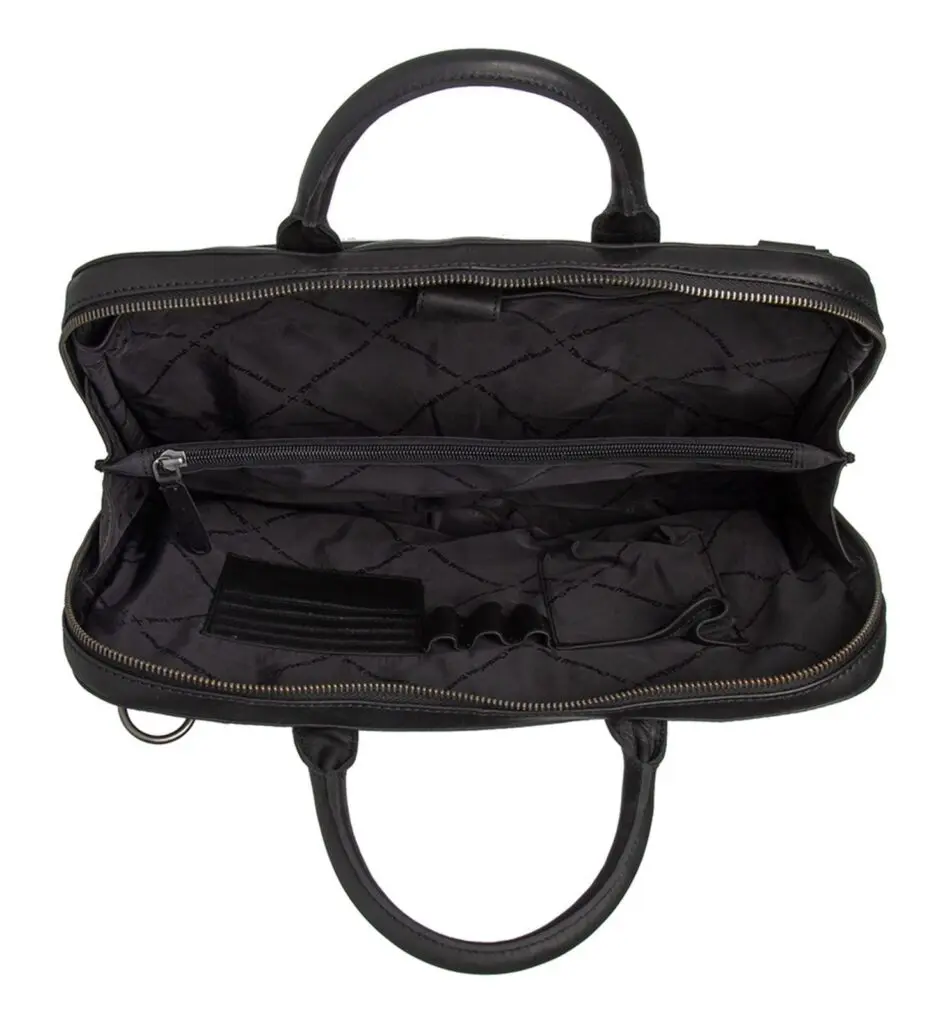 Leðurfartölvutaskan Tilbury frá The Chesterfield Brand er fullkomin fyrir þá sem vilja mæta í viðskiptafundi með stæl. Þessi taska býður upp á fullkomna jafnvægi milli stíl og virkni, sem tryggir að þú skiljir alltaf eftir góðan svip og haldir þig vel skipulagðan. Með hugvitsamlegri hönnun og nákvæmri frágangi er Tilbury-taskan með rúmgóðu aðalhólfi sem lokast með rennilás. Að innan er rennilásvasi í miðjunni sem skiptir aðalhólfinu í tvo hluta, sem gerir þér kleift að skipuleggja eigur þínar fullkomlega. Öðru megin við hólfið er styrkt fartölvuhulstur sem hentar fyrir fartölvur allt að 14 tommu. Hinu megin finnur þú ýmsa geymsluvasa: skipuleggjara fyrir þrjá penna og fjögur kort, vasa fyrir snjallsíma og nægilegt pláss fyrir skjöl. Að auki er í taskan pláss fyrir veski, lykla, gleraugnahulstur, nestispakka og vatnsflösku, svo þú getir auðveldlega borið allt sem þú þarft.