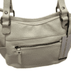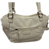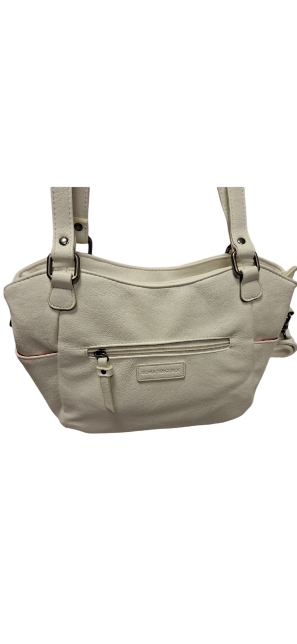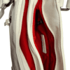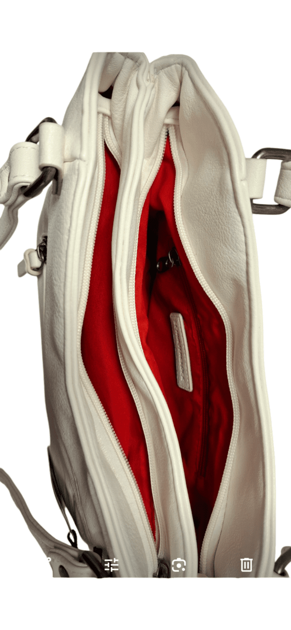 Taskan er tvöfold með rauðri innréttingu ,aftara hólfið er með tveim símavösum seinna hólfið er með rendum vasa .Rendir vasar að framan og aftan ásamt langri axlaról.