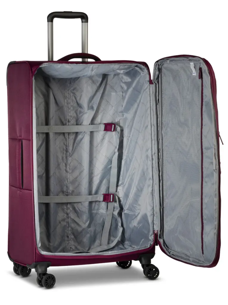 Aðalhólf með rennilás, litlum vasa úr möskva með rennilás og 2 ólum með spennu 1 stækkanlegt hólf með rennilás og 2 ólum með spennu 2 vasar með rennilás að framan 4 x 360° tvöföld hjól TSA lás