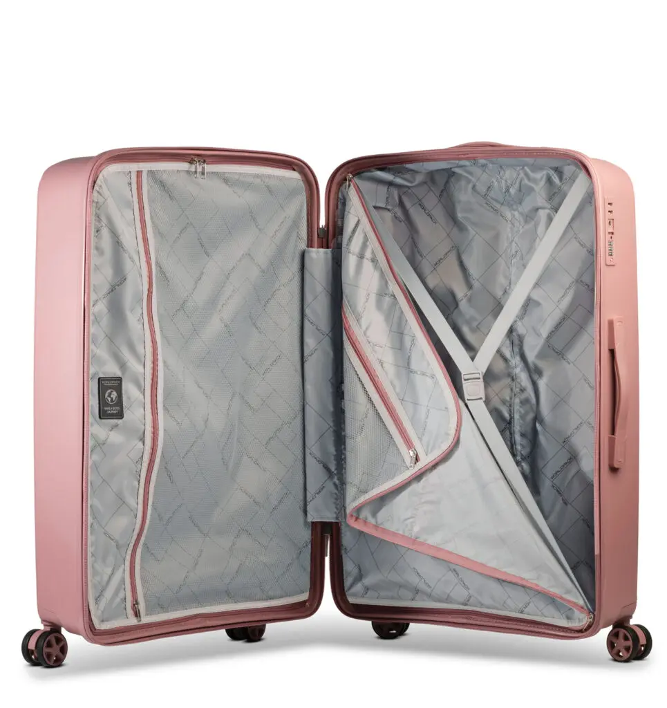 Stór rennilásskilrúm með rennilásvasa úr möskva og 2 rennilásvösum Teygjuólar með spennulokun á báðum hliðum 4 x 360° tvöföld hjól TSA lás Pólýprópýlen