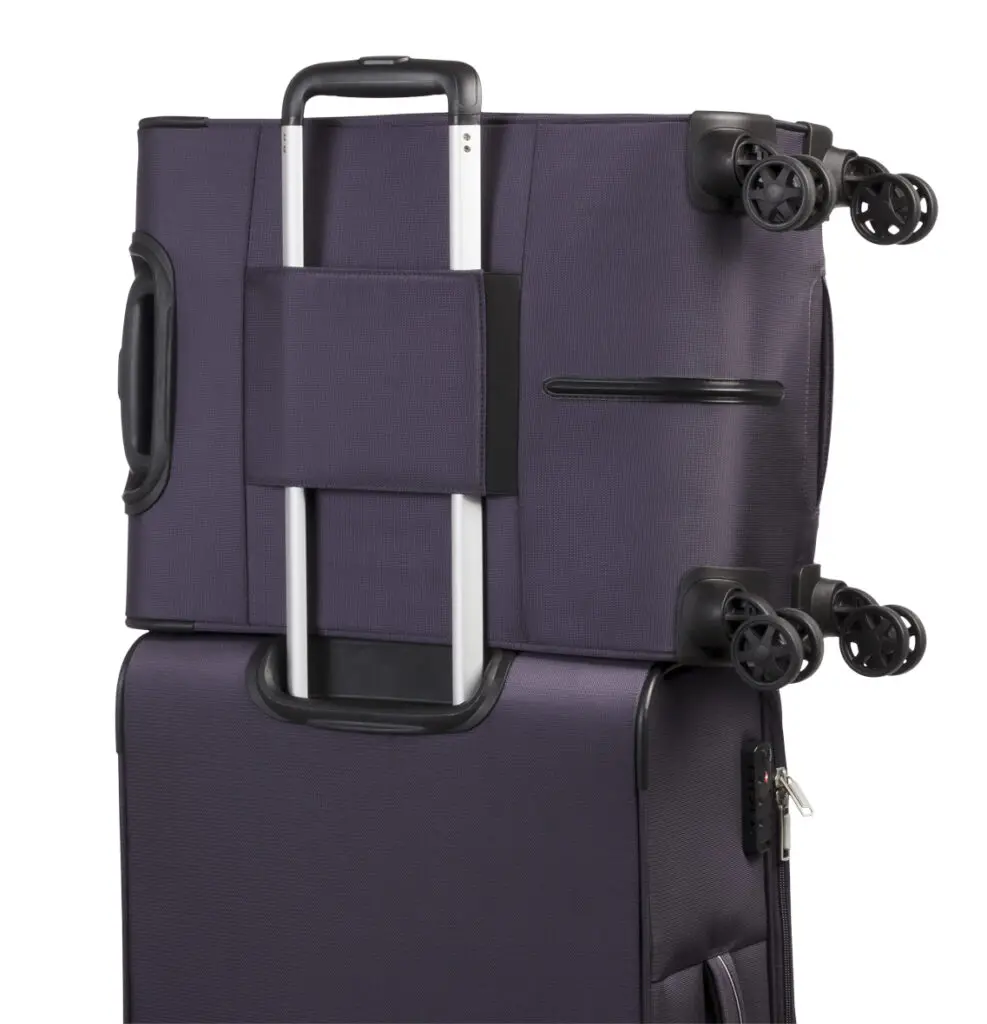 Aðalhólf með rennilás, litlum vasa úr möskva með rennilás og 2 teygjuólum með spennulokun 1 stækkanlegt hólf með rennilás og 2 teygjuólum með spennulokun 2 vasar með rennilás að framan 4 x 360° tvöföld hjól TSA lás Með ól til að hengja á handfang á stærri tösku